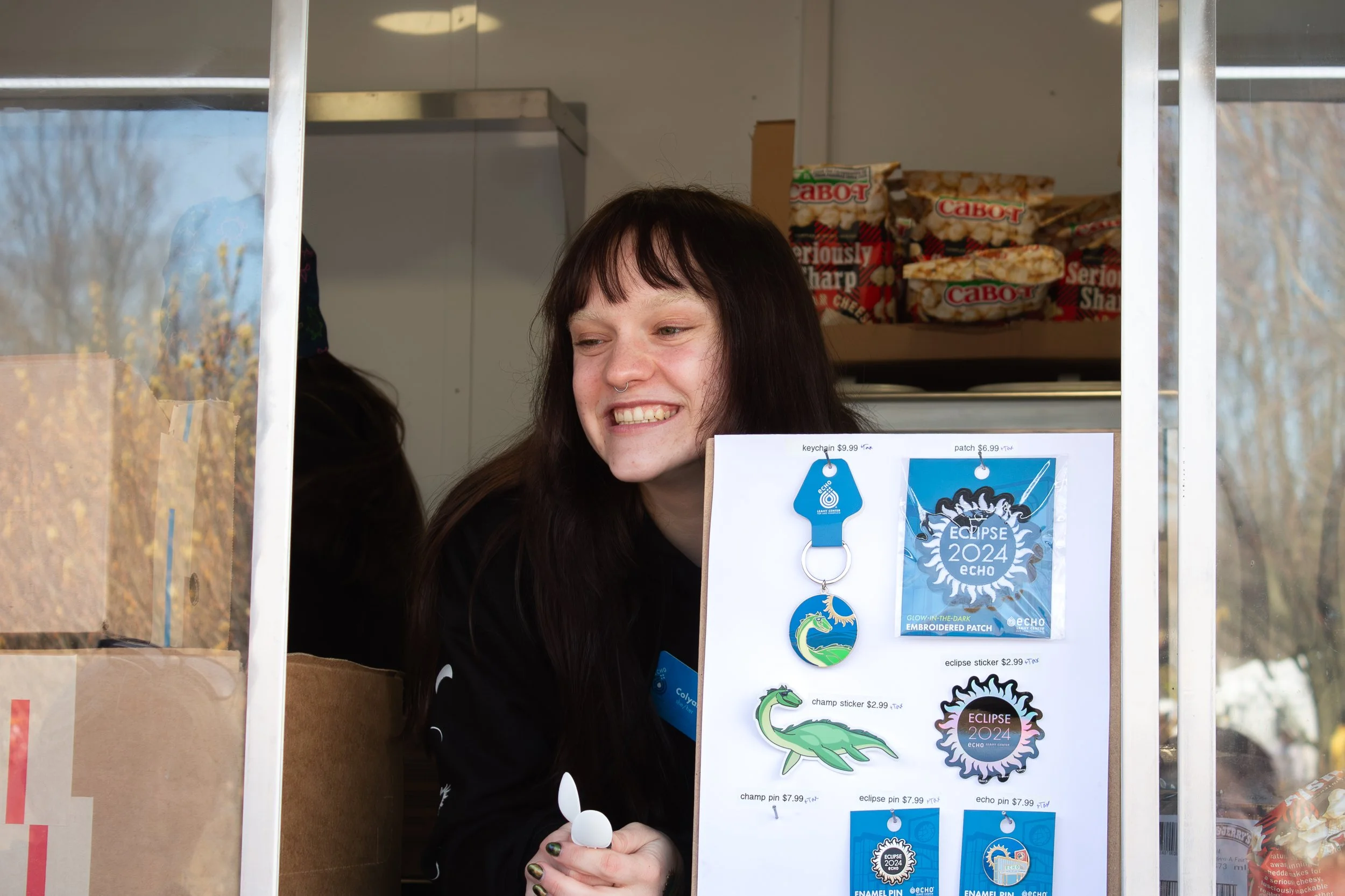 In addition to creating graphics and writing copy for digital marketing ahead of the event, I designed custom eclipse glasses, wayfinding signage, visitor guides, volunteer packets, and even vinyl decals for a giant pair of eclipse glasses crafted by Elliott Katz, ECHO’s Senior Exhibits Designer. My work carried the Eclipse 2024 brand throughout the event, from outside the front doors through indoor educational stations—where volunteers used outreach kit materials to lead activities—and out onto the waterfront, where visitors looked skyward while sporting ECHO merchandise and custom glasses.